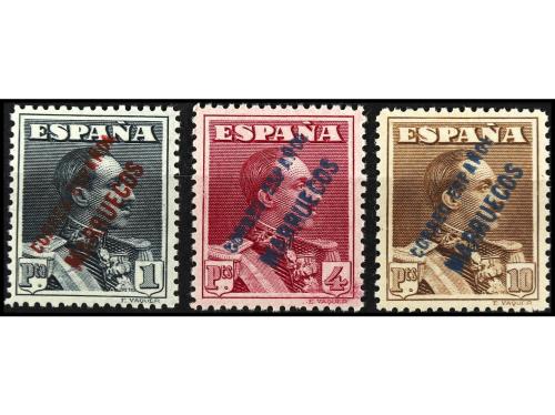 ** COLONIAS ESPAÑOLAS: TANGER. Ed. NE 1/3. NO EXPENDIDOS. 25 cts. azul, 4 pts. violeta y 10 pts. naranja. Centrajes pefectos. RARÍSIMOS en esta calidad. LUJO.