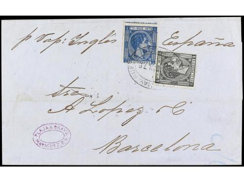 PUERTO RICO. Ed. 25, 26. 1879. MAYAGUEZ a BARCELONA. 15 cts. verde y 25 cts. azul, al dorso llegada. Muy bonita.
