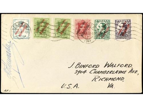 COLONIAS ESPAÑOLAS: TANGER. Ed. 13, 17 (2), 18, 64, 66. 1932. TÁNGER a U.S.A. Precioso franqueo para componer los 40 cts. de la tarifa a USA.