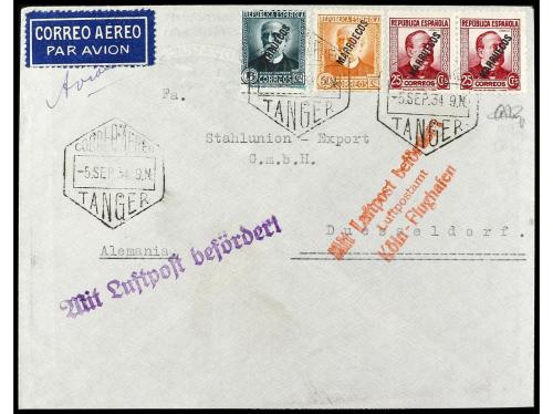 COLONIAS ESPAÑOLAS: TANGER. Ed. 74, 76 (2), 79. 1934. TÁNGER a ALEMANIA. 25 cts. carmín (2), 15 cts. verde y 50 cts. naranja, al dorso llegada.