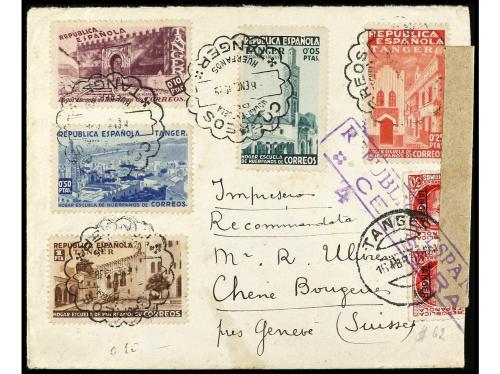 COLONIAS ESPAÑOLAS: TANGER. Ed. 77 (2). 1938. TÁNGER a SUIZA. 30 cts. carmín (2) más 5 sellos del Hogar Escuela de Huérfanos, al dorso llegada. Rara combinación.