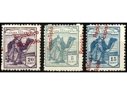 ** COLONIAS ESPAÑOLAS: SAHARA. Ed. 36 y 38 hdv y 39Bhdx. 5, 15 y 25 cts. HABILITACIÓN DESPLAZADA. RAROS. Cat. 475€.
