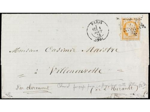FRANCIA. 1873. PARÍS a VILLENEUVETTE. Circulada con sello de Colonias Generales (Yv. 13) con dentado particular para hacerlo pasar como un sello de Francia. Muy raro fraude al correo. Firmado CALVES y cert. BRUN.