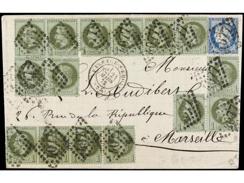 FRANCIA. Yv. 25 (15), 37. 1872. VALENCE a MARSEILLE. 1 cto. verde (15) y 25 cts. azul. Espectacular combinación de franqueo.