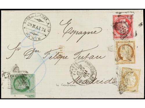 FRANCIA. Yv. 38, 53, 57, 59. 1874. PARÍS a MADRID. 5 cts. verde, 15 cts. bistre, 40 cts. naranja y 80 cts. rosa. Rara combinación de franqueo.