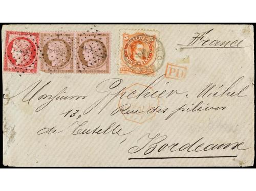 FRANCIA. Yv. 57, 58 (2). 1874. BUENOS AIRES a BORDEAUX. Circulada con sello argentino de 5 ctvs. rojo y sellos franceses de 10 cts. castaño (uno defecto) y 80 cts. rosa mat. ancla.