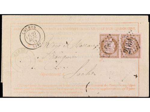 FRANCIA. Yv. 58c. 1873. LOCHES a PARIS. Recibo de carta certificada circulada con una pareja CAPICÚA (Tete-Beche) del 10 cts. castaño y rosa. Muy bonito.