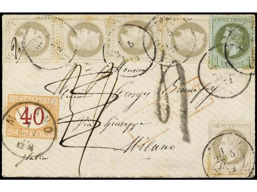 FRANCIA. Yv. 25, 27 (5). 1872. Sobre circulado a MILÁN (Italia) con franqueo de 1 cto. verde y 4 cts.gris (5) a la llegada tasada con sello italiano de 40 cts. Algunas manchas del tiempo pero muy rara combinación de franqueo.