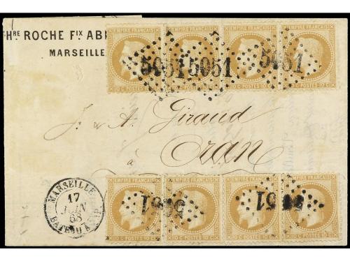 FRANCIA. Yv. 28 (8). 1868. MARSEILLE a ORÁN. 10 cts. bistre (6). Precioso franqueo.