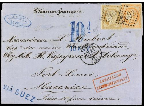 FRANCIA. Yv. 36, 48. 1871. NANTES a PORT LOUISE (Isla Mauricio). 10 cts. bistre y 40 cts. naranja. Al dorso llegada y marca 10 d. / TO PAY.