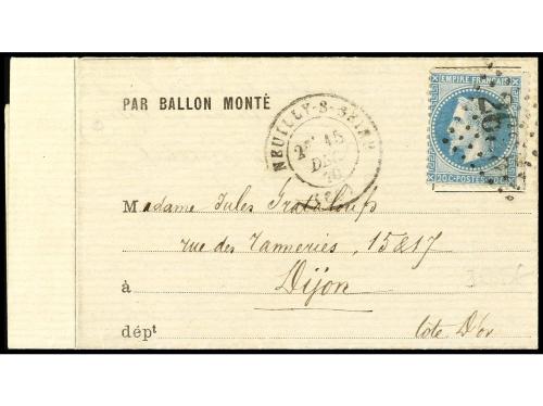 FRANCIA. Yv. 29. 1870 (15 diciembre). NEUILLY a DIJON. 20 cts. azul circulado por BALLON MONTE "Parmentier".