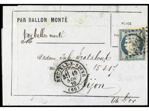 FRANCIA. Yv. 37. 1870 (19 noviembre). NEUILLY a DIJON. 20 cts. azul circulado por BALLON MONTE "Arachimede".