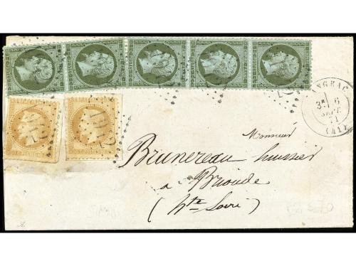 FRANCIA. Yv. 25 (5), 45. 1871. BOSTREVEN a BREST. 1 cto. verde (5), 20 cts. azul. Muy bonita.