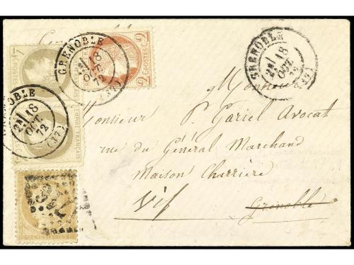 FRANCIA. Yv. 51, 52 (2), 55. 1872. GRENOBLE, correo interior 2 cts. castaño rojo, 4 cts. gris (2) (un sello leve defecto) reexpedida a VIF con sello de 15 cts. bistre. Rara combinación de franqueo.