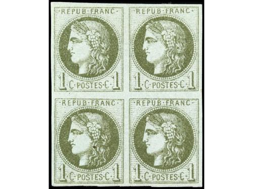 * FRANCIA. Yv. 39C (4). 1 c. oliva. Reporte 3. 1er estado. Bloque de cuatro (un sello adelgazado, (thined). Cat. 850€.