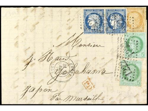 FRANCIA. Yv. 53 (2), 60 (2), 38. 1872. CREST a YOKOHAMA (Japón). 5 cts. verde, 25 cts. azul (2) y 40 cts. naranja. Inusual destinación.