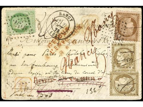 FRANCIA. Yv. 53, 56 (2), 58. 1873. NANCY. Carta certificada con sucesivas reexpediciones.