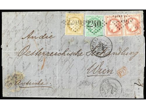 FRANCIA. Yv. 32 (2), 53, 55. 1872. MARSEILLE a VIENA (Austria). 5 cts. verde, 15 cts. bistre y 80 cts. rosa (2).