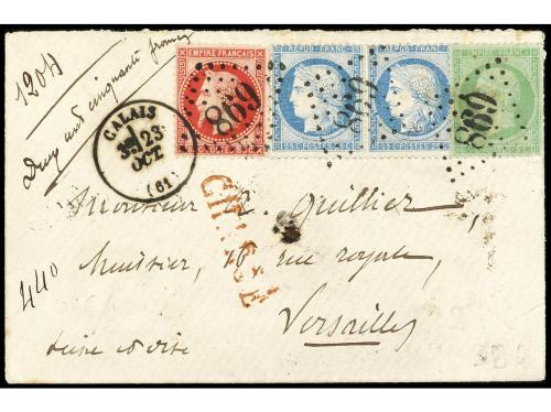 FRANCIA. Yv. 32, 35, 37 (2). 1871. CALAIS a VERSAILLES. 5 cts. verde, 25 cts. azul (2) y 80 cts. carmín. Carta certificada. PRECIOSA.