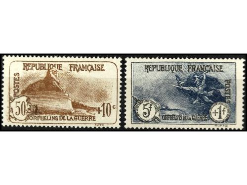 ** FRANCIA. Yv. 230, 232. 50 c. + 10 c. castaño y 5 f. + 1 f. negro y azul. MUY BONITOS. 5 f. + 1 f. impureza natural del papel visible al dorso (impureté naturelle du papier). Cat. +420€.