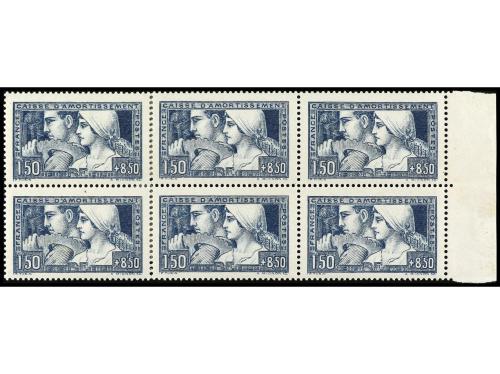**/* FRANCIA. Yv. 252 (6). 1,50 f. + 8,50 f. azul. Los 3 tipos, en bloque de 6. Centrados de lujo. Los sellos del tipo I sin fijasellos. RARO y de LUJO.
