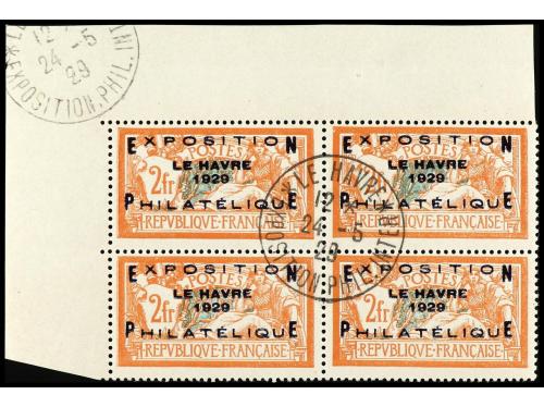 ** FRANCIA. Yv. 257A (4). 2 f. naranja y verde azul. Bloque de cuatro, mat. de la Expo. 24-5-29. Esquina de hoja. Sellos con goma. LUJO. Cat. +3.600€.