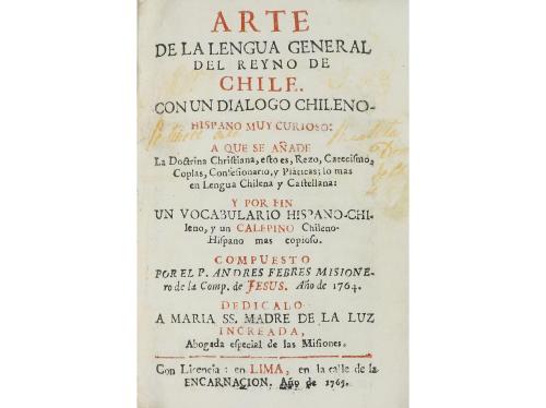 1765. LIBRO. (LENGUAS INDÍGENAS). ARTE DE LA LENGUA GENERAL DEL REYNO DE CHILE. CON UN DIALOGO CHILENO-HISPANO MUY CURIOSO.: A QUE SE AÑADE LA DOCTRINA CHRISTIANA... Lima: imp. en calle de la Encarnación, 1765. 8º menor. 15 h. + 682 p. + 1 h. Portada y preliminares a dos tintas, con anotaciones de época en la portada. Culs-de-lampe xilográficos. Completo. Algo corto de margen superior pero no afecta caja de texto. Enc. en pergamino de época, rastro de cortes jaspeados, lomera rotulada. Ex-libris. Heredia 1510. Palau 87065, apunta "libro curioso y estimado. Se dice que Andrés Febrés es seudónimo del Padre Manuel José Álvarez". CCPB 509557-3. Primera Edición de esta gramática y vocabulario de la lengua araucana o mapuche.