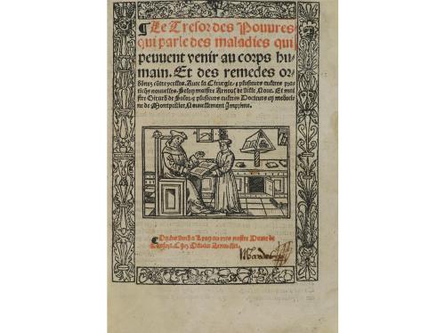 1567. LIBRO. (GÓTICO-MEDICINA). LE TRESOR DES POUVRES QUI PARLE DES MALADIES QUI PEUVENT VENIR AU CORPS HUMAIN. Lyon: Chez Olivier Arnoullet, 1567. 8º mayor. Tipografía gótica. 3 h. + CXIII fol. Portada a dos tintas con grabado y orla xilográficos. Capitales xilográficas. Al verso de la última h. grabado tipográfico. Son facsímiles los fol. XXXV a XXXVIII (sign. f2 a f5) y corresponden a los temas de concepción y reproducción, quizás fue mutilado a propósito. Restauración en la esquina interior inferior hasta el fol. XXIII y en los fol. XXXIX y XXXX, muy bien realizada. Ex-libris manuscrito en la portada, de época y otro moderno. Enc. en pergamino rígido, tejuelo. Ex-libris. No en CCPB. Palau 365609. Sólo hemos visto ejemplar en la Biblioteca de Catalunya y en BNFr.