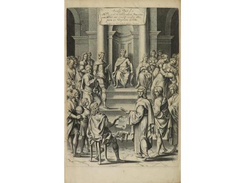 1654. LIBRO. (LITERATURA CLÁSICA). THE WORKS OF PUBLIUS VIRGILIUS MARO TRANSLATED, ADORND WITH SCULPTURE, AND ILLUSTRATED WITH ANNOTATIONS BY... London: Printed by Thomas Warren, 1654. Gran folio. Retrato grabado del traductor + Frontis grabado + portada a dos tintas + 4 h. + 586 p. Ilustr., además de los citados, con 97 grabados en el texto, un mapa a doble página (en cartivana), cabeceras , capitales y cules-de-lampe también grabados. Ejemplar limpio, con todos sus márgenes y en buen papel verjurado y filigrana. Apostillas marginales. Enc. en plena piel de época, planos muy rozados, lomera craquelada, cajo anterior sesgado y práctiamente desprendido, cortes pintados, antigua etiqueta en el plano anterior con el núm. 138. Primera edición de la traducción al inglés de la obra de Virgilio.