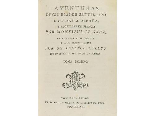 1788-1791. LIBRO. (LITERATURA). AVENTURAS DE GIL BLAS DE SANTILLANA ROBADAS A ESPAÑA, Y ADOPTADAS EN FRANCIA POR MONSIEUR LE SAGE, RESTITUIDAS A SU PATRIA Y A SU LENGUA NATIVA POR UN ESPAÑOL ZELOSO. Valencia: Benito Monfort, 1788-1791. 6 vol. en 8º mayor. I: 16 h. + 336 p. II: 2 h. + 283 p. III: 2 h. + 287 p. IV: 2 h. + 328 p. V: 2 h. + 344 p. VI: 3 h. (la hoja de tabla traspuesta al principio de la obra) + 208 p. Seis vol. enc. en pasta española, doble tejuelo, lomera decorada, nervios, cortes pintados, cantos levemente rozados. Colección sin el último volumen, de esta cuidada edición valenciana. Palau 136299.