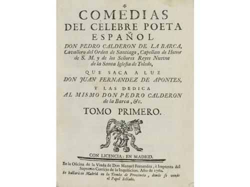 1760-1763. LIBRO. (LITERATURA). COMEDIAS DEL CELEBRE POETA... QUE SACA A LA LUZ DON JUAN FERNANDEZ DE APONTES. Madrid: Oficina de la Viuda de Don Manuel Fernandez, è imprenta del Supremo Consejo de la Insquisición, 1760-1763. 9 tomos en 8 vol. en 8º mayor, faltan los volúmenes V y IX. I: 4 h. + 492 p. II: 2 h. +496. III: 2 h. + 499 p. IV: 2 h. + 539 p. VI: 2 h. + 528 p. VII: 2 h. + 484 p. VIII: 2 h. + 475 p. X y XI: 4 h. + 480 p. + 232 p. Texto a dos columnas, cabeceras xilográficas. Presentamos 9 tomos enc. en 8 vol. en pasta española, doble tejuelo, planos rozados y con alguna peladura y cantos rozados, deslucida. Palau 39766, llevan un orden diferente a la colección publicada por Vera Tasis.