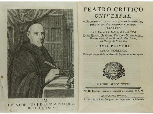 1777-1779. LIBRO. (LITERATURA). CARTAS ERUDITAS, Y CURIOSAS. Madrid: Imp. Joachin Ibarra, 1777- 1779. 15 vol en 8º mayor. I: XXXVI + 375 p. II: XXXII + 430 p. Pequeña falta con pérdida en la esquina de la p. 93 y portada de este vol. facsímil. III: LVI + 408 p. IV: XL + 394 p. V: XVI + 454 p. TEATRO CRITICO UNIVERSAL, Ó DISCURSOS VARIOS... I: retrato grabado + LXXXII + 414 p. II: XXXII + 439 p. III: LVI + 395 p. IV: XL + 478 p. V: XLVIII + 432 p. VI: XLVIII + 419 p. VII: XLIV + 446 p. VIII: LVI + 459 p. ILUSTRACION APOLOGETICA... Imp. Pantaleon y Aznar, 1777. XXXII + 248 [Sigue:] JUSTA REPULSA... 9 h. + 164 p. [Sigue:] ADICIONES A LAS OBRAS... Imp. Pedro Marin, 1783. 2 h. + 75 p. INDICE GENERAL ALFABETICO DE LAS COSAS NOTABLES... Imp. Antonio de Sancha, 1774. 9 h. + 248 p. Quince vol. enc. en pergamino de época. Leve sombra de óxido, en general limpio.