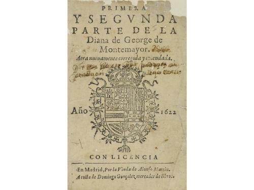 1622. LIBRO. (LITERATURA CASTELLANA). PRIMERA Y SEGUNDA PARTE DE LA DIANA. Madrid: Vda. de Alonso Martin, 1622. 8º menor. 8 h. + 440 fol. Portada laminada, el margen superior con levísima pérdida que no afecta caja de texto, restauración marginal de las dos siguientes hojas. Algún pliego ligeramente tostado. Enc. pergamino reciente, lomera rotulada. Ex-libris. Antigua marca de posesión en la portada. Palau 177969. Novela que cuenta con muchas ediciones, hecho que evidencia su gran influencia en la novela pastoril.