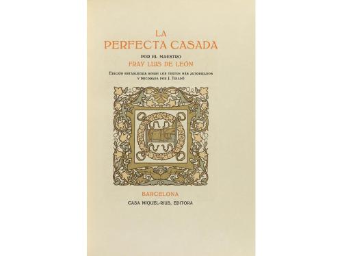 1930. LIBRO. (LITERATURA). LA PERFECTA CASADA. Edición establecida sobre los textos más autorizados y decorada por J. Triadó. Barcelona: Casa Miquel-Rius Editora, 1930. 8º. 225 p. Enc. firmada por Miquel Rius en plena piel, hilos dorados en ambos planos, lomera decordada, cortes dorados, cantos y cejas, presentado en una petaca de tela con perfiles de piel. Edición dirigida por R. Miquel i Planas, ejemplar en papel japón de la tirada nominada y numerada de 50.