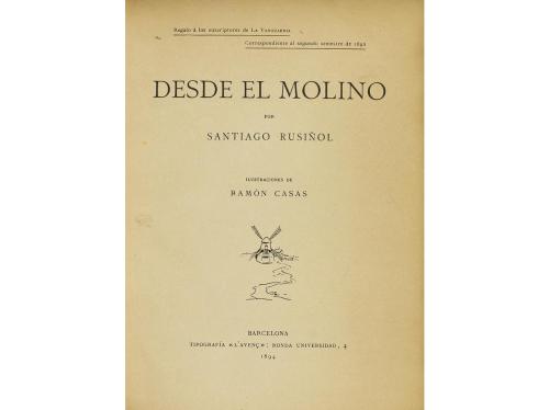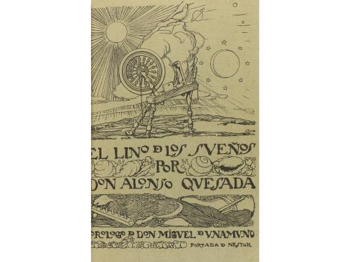 1915. LIBRO. (LITERATURA). EL LINO DE LOS SUEÑOS. Prólogo de Miquel de Unamuno y una epístola de Tomás Morales. Madrid: imp. Clásica española, 1915. 8º. XVII p. + 145 p.+ 1 h. Retrato del autor en lámina en color firmada en plancha por Nestor [Martín Fernández de la Torre], ex-libris. Enc. en media piel, nervios, conserva las cubiertas originales con dibujo muy surrealista de Néstor. Rafael Romero Quesada (1886- 1925), en su corta vida tuvo tiempo de dejar una extensa obra, en prosa y verso, publicada en su mayor parte póstumamente en varios volúmenes. Este es su libro más conocido con prólogo de Unamuno, al que había conocido en 1910.