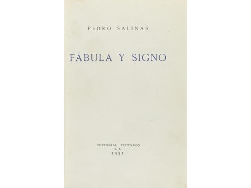 1931. LIBRO. (GENERACIÓN '27). FÁBULA Y SIGNO. Madrid: Editorial Plutarco, 1931. 8º mayor. 113 p. + 1 h. Enc. en media piel, nervios, conserva las cubiertas originales, lomera descolorida. Ex-libris. Edición numerada de 1000 ejemplares. Primera edición. Palau 287570.