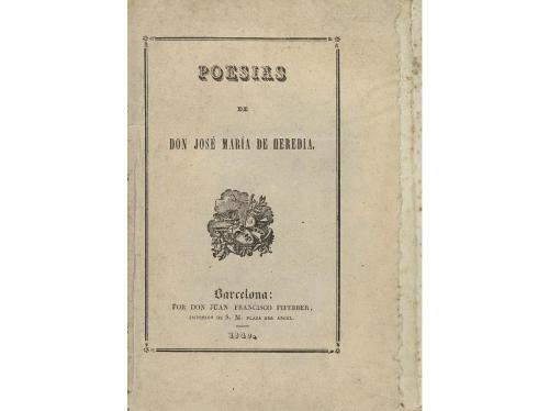 1840. LIBRO. (LITERATURA). POESÍAS. Barcelona: Juan Francisco Piferrer, 1840. 8º. 1 h. + 197 p. + 2 h. Viñetas en el texto. Intonso, con las barbas. Leve óxido. Rústica editorial. El poeta cubano José María de Heredia está considerado el iniciador del romanticismo en latinoamérica. Esta es la primera edición póstuma de sus poesías.