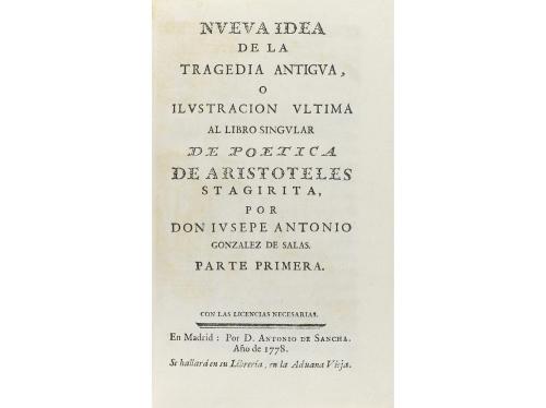 1778. LIBRO. (LITERATURA CLÁSICA). NUEVA IDEA DE LA TRAGECIA ANTIGUA, O ILUSTRACION ULTIMA AL LIBRO SINGULAR DE POETICA DE ARISTOTELES STAGIRITA. Madrid: Antonio de Sancha, 1778. 8º. Frontis grabado + 12 h. + 311 p. + 1 lám. [Sigue:] ID.: TRAGEDIA PRACTICA I OBSERVACIONES, QUE DEBEN PRECEDER A LA TRAGEDIA ESPAÑOLA INTITULADA: LAS TROIANAS. Id. 2 h. +280 p. + 2 h. + 1 lám. Enc. en media piel, planos de cartoné, cortes pintados.