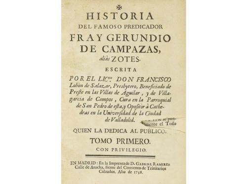 1758-1770. LIBRO. (LITERATURA). HISTORIA DEL FAMOSO PREDICADOR FRAY GERUNDIO DE CAMPAZAS, aliàs ZOTES. ESCRITA POR... TOMO I. Madrid: Imp. de Gabriel Ramirez, 1758. 8º mayor. 56 h. + 335 p. + 6 h. Cabeceras, capitales xilográficas. Falta de papel en la portada. Edición príncipe de este vol. I. Enc. en pleno pergamino de época. Sello húmedo. CCPB 368705-8. Palau 121917. [Más:] ID. TOMO SEGUNDO. En Campazas: a costa de los herederos de Fray Gerundio, 1770. 313 p. Cabecera y capitales xilográficas. Falta de papel en la portada. CCPB 67557-1. Palau 121919. Dos vol. enc. en pasta española, doble tejuelo, nervios.