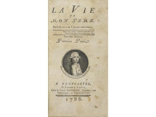 1788. LIBRO. (LITERATURA FRANCESA). LA VIE DE MON PERE. Nufchatel y París: Chez la veuve Duchesne, 1788. 2 vol. en 8º menor. I: Portada con un retrato en orla + 232 p. y 5 lám. grabadas. Sin el frontis. II: Frontis + 222 p. + 5 lám. grabadas. Antiguo ex-libris manuscrito. Dos vol. enc. en plena piel de época, doble tejuelo, nervios, lomera cuajada, corte superior pintado, cantos rozados.