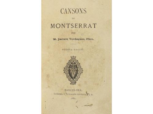 1885. LIBRO. (LITERATURA-DEDICATORIA). CANSONS DE MONTSERRAT. Barcelona: Llibrería y Tipografía católica, 1885. 8º menor. 66 p. + 2 h. Enc. reciente en plena piel, hilos dorados, nervios, cortes dorados, cantos y cejas decoradas, bonito papel de guardas en rojo y dorado. Primera Edición. El ejemplar lleva una dedicatoria en catalán manuscrita del autor .