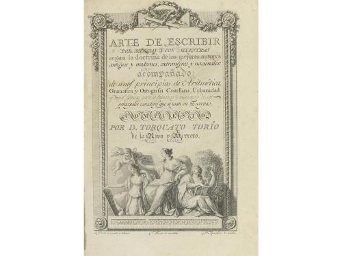1798. LIBRO. (CALIGRAFÍA). ARTE DE ESCRIBIR POR REGLAS Y CON MUESTRAS SEGUN LA DOCTRINA DE LOS MEJORES. AUTORES ANTIGUOS y modernos, extrangeros y nacionales. Madrid: Imp. Joaquin Ibarra, 1798. 8º mayor. Frontis grabado + XXVIII + 418 p. + 1 h. y 58 lám. grabadas , fuera del texto. Señal de óxido. Alguna marca de lápiz. Enc. en pasta española, tejuelo, cortes pintados, planos rozados.