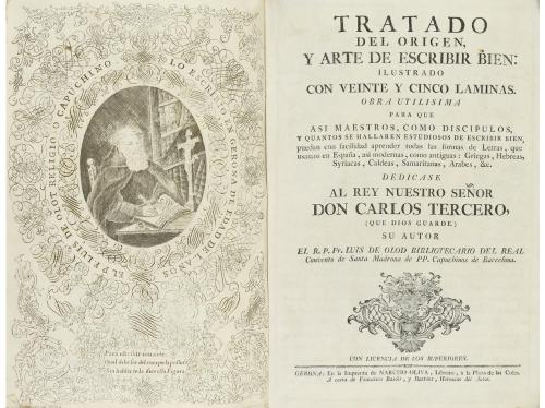 1766. LIBRO. (CALIGRAFÍA-TIPOGRAFIA). TRATADO DEL ORIGEN, Y ARTE DE ESCRIBIR BIEN. Gerona: Imp. Narciso Oliva, 1766. Folio menor. Frontis grabado con retrato del autor y un retrato grabado del rey sobre la dedicatoria + 6 h. + 136 p. + 24 lám. grabadas. Dos hojas desprendidas pero completo. Enc. en pergamino de época. El autor era fraile capuchino, y redactó la obra durante varios años y estando en diversos conventos, cuando la publica tiene el cargo de Bibliotecario en el Real Convento de Santa Madrona de Barcelona. Contiene normas gramaticales y de abreviaturas, describe los instrumentos necesarios para una buena escritura, y da varias fórmulas para la fabricación de tintas, para escribir, sombrear, dibujar, imprimir y grabar, de colores, e invisibles. Todas las láminas están grabadas al cobre por Joan Petroschi en Roma. Enc. en pergamino. Palau 201092, primera edición.