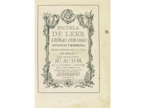 1780. LIBRO. (CALIGRAFÍA-PALEOGRAFÍA). ESCUELA PALEOGRAPHICA, Ó DE LEER LETRAS ANTIGUAS, DESDE LA ENTRADA DE LOS GODOS EN ESPAÑA, HASTA NUESTROS TIEMPOS. Madrid: Imp. Juan Antonio Lozano, 1780. Folio. 18 h. + 443 p. Contiene 49 lám., todas ellas grabadas por Francisco Asensio y Mejorada, al igual que el frontispicio. Frontis decorado en orla algo sucio, el resto bien, con el papel de hilo verjurado muy limpio. Enc. en plena piel, nervios, tejuelo, ligeramente rozada, cortes pintados. El P. Merino trabajó en asuntos pedagógicos, lingüísticos y religiosos, pero donde más sobresalió fue en el campo de la paleografía. Su perfecto conocimiento del latín, griego y árabe le llevaron a la realización de trabajos lingüísticos muy relevantes. Escuela paleographica es el primer tratado serio de paleografía española, después de los modestos ensayos de Rodríguez y de Terreros. PRIMERA EDICION. Palau 165667. Salva 2325.