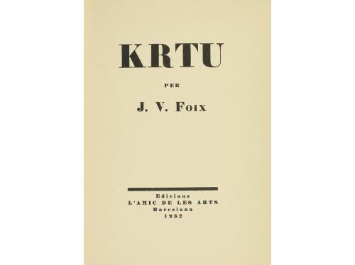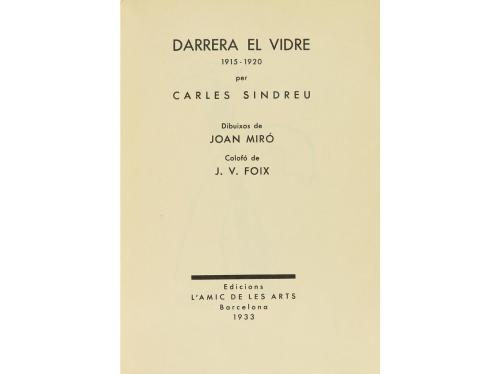 1933. LIBRO. (LITERATURA CATALANA). DARRERA EL VIDRE, 1915-1920. Barcelona: L'Amic de les Arts, 1933. 8º mayor. Sin paginar, intonso. Ilustrado con dibujos de Joan Miró y con colofón de J. V. Foix. Ejemplar de los VIII sobre papel japón y numerados a la romana, con la firma del autor. Rústica, algo sucia.