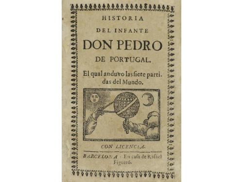 1680 ca. LIBRO. (LITERATURA-CABALLERÍAS). HISTORIA DEL INFANTE DON PEDRO DE PORTUGAL. EL QUAL ANDUVO LAS SIETE PARTIDAS DEL MUNDO. Barcelona: En casa de Rafael Figueró. 12º. 32 p. + 1 b. Portada en orla xilográfica y con grabado tipográfico. Enc. en cartoné reciente por Caballero. Palau 216252. CCPB 811160-X .