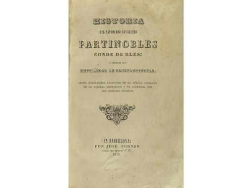 1842. LIBRO. (LITERATURA-CABALLERÍA). HISTORIA DEL ESFORÇADO CAVALLERO PARTINOBLES CONDE DE BLES; Y DESPUES FUE EMPERADOR DE CONSTANTINOPLA. Ahora nuevamente traducida de la lengua catalana en la nuestra castellana y va adornada con muy g. Barcelona: Por José Torner, 1842. 8º mayor. VIII p. + de la pag. 5 a la pag. 221. Numerosas ilustraciones grabadas en el texto, culs-de-lampe. Leve señal de óxido. Portada con punta restaurada. Enc. media piel, planos de guáflex. Ex-libris.