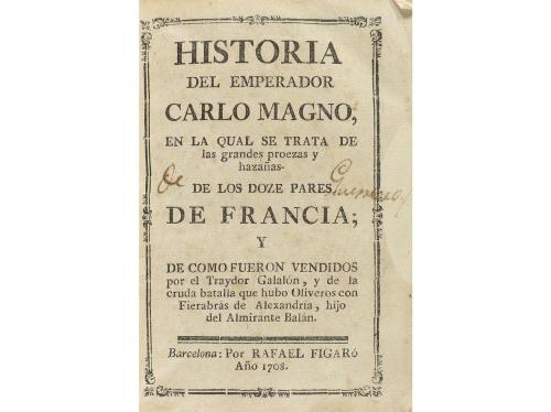 1708. LIBRO. (LITERATURA CABALLERÍA). HISTORIA DEL EMPERADOR CARLO MAGNO, EN LA QUAL SE TRATA DE LAS GRANDES PROEZAS Y HAZAÑAS- DE LOS DOZE PARES DE FRANCIA; Y DE COMO FUERON VENDIDOS POR EL TRAYDOR GALALÓN... Barcelona: Rafael Figaró, 1708. 8º menor. 3 h. + 298 p. Ex-libris manuscrito en la portada y al final de la obra. Enc. en pergamino de época. Palau 44269. CCPB 497935-4. Existen otras ediciones del mismo año e impresor, que demuestran la enorme popularidad del texto.