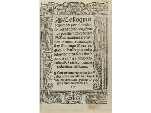 1571. LIBRO. (GÓTICO). COLLOQUIO DEL PECADOR Y DEL CRUCIFIXO, CON OTROS OPUSCULOS, CO[M]PUESTOS POR EL SERAPHICO DOCTOR S... Çaragoça: Imp. Pedro Bernuz, 1571. 8º menor. 8 h. + 153 fol. + 1 h. Tipografía gótica. Portada en orla xilográfica, capitales y marca tipográfica al final xilográficas. Varios grabados xilográficos Texto con apostillas marginales. Finos taladros restaurados, remarginaciones en las primeras y últimas hojas, cuadernillos procedentes de otro ejemplar. Enc. en pergamino, lomera rotulada. Palau 290207. CCPB 3666-8.