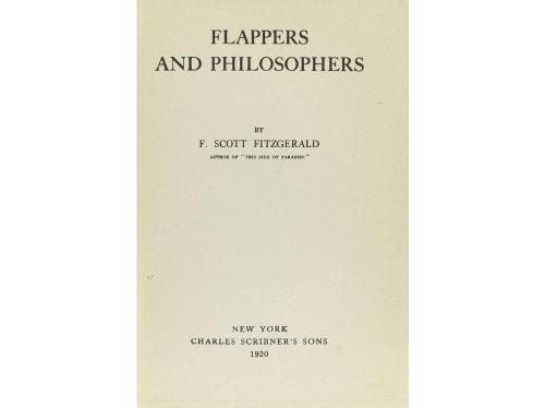 1920. LIBRO. (LITERATURA). FLAPPERS AND PHILOSOPHERS. New York: Charles Scribner's son, 1920. 8º mayor. 3 h. + 269 p.+ 1 b. Enc. en tela edit. verde, letrería dorada en el lomo y en seco en el plano anterior. PRIMERA EDICIÓN de este libro de relatos publicado el mismo año que la obra que le dio la fama "This side of Paradise". Ex-libris.